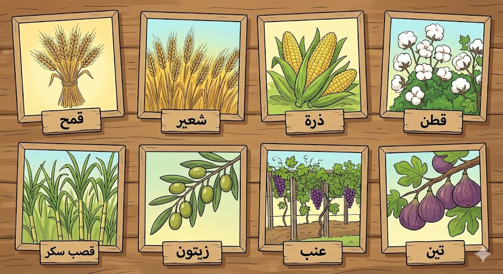 القمح، الشعير، الذرة، القطن، قصب السكر، الزيتون، العنب، التين.