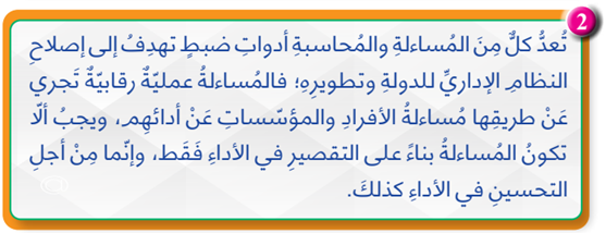 المساءلة: عملية رقابية يتم من خلالها مساءلة الأفراد والمؤسسات عن أدائهم، ولا تقتصر على التقصير فقط بل تهدف أيضًا إلى تحسين الأداء.