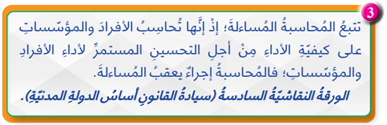 المحاسبة: إجراء يأتي بعد المساءلة، ويتم من خلاله محاسبة الأفراد والمؤسسات على كيفية الأداء لتحقيق التحسين المستمر.